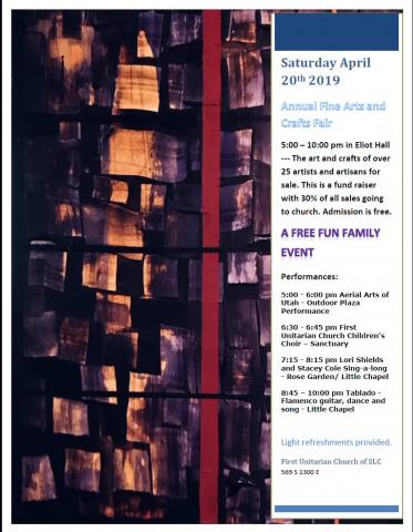 No admission. Performance and Visual Art. Light Refreshments. Easter Weekend. April 20th and 21st, 2019. It is a three ring circus of the arts. Saturday April 20th 2019 Annual Fine Arts and Crafts Fair 5:00 – 10:00 pm in Eliot Hall --- The art and crafts of over 25 artists and artisans for sale. This is a fund raiser with 30% of all sales going to church. Admission is free. A Free Fun Family Event Performances: 5:00 - 6:00 pm Aerial Arts of Utah - Outdoor Plaza Performance 6:30 - 6:45 pm First Unitarian Church Children’s Choir – Sanctuary 7:15 - 8:15 pm Lori Shields and Stacey Cole Sing-a-long - Rose Garden/ Little Chapel 8:45 – 10:00 pm Tablado - Flamenco guitar, dance and song - Little Chapel Light refreshments provided. First Unitarian Church of SLC 569 S 1300 E